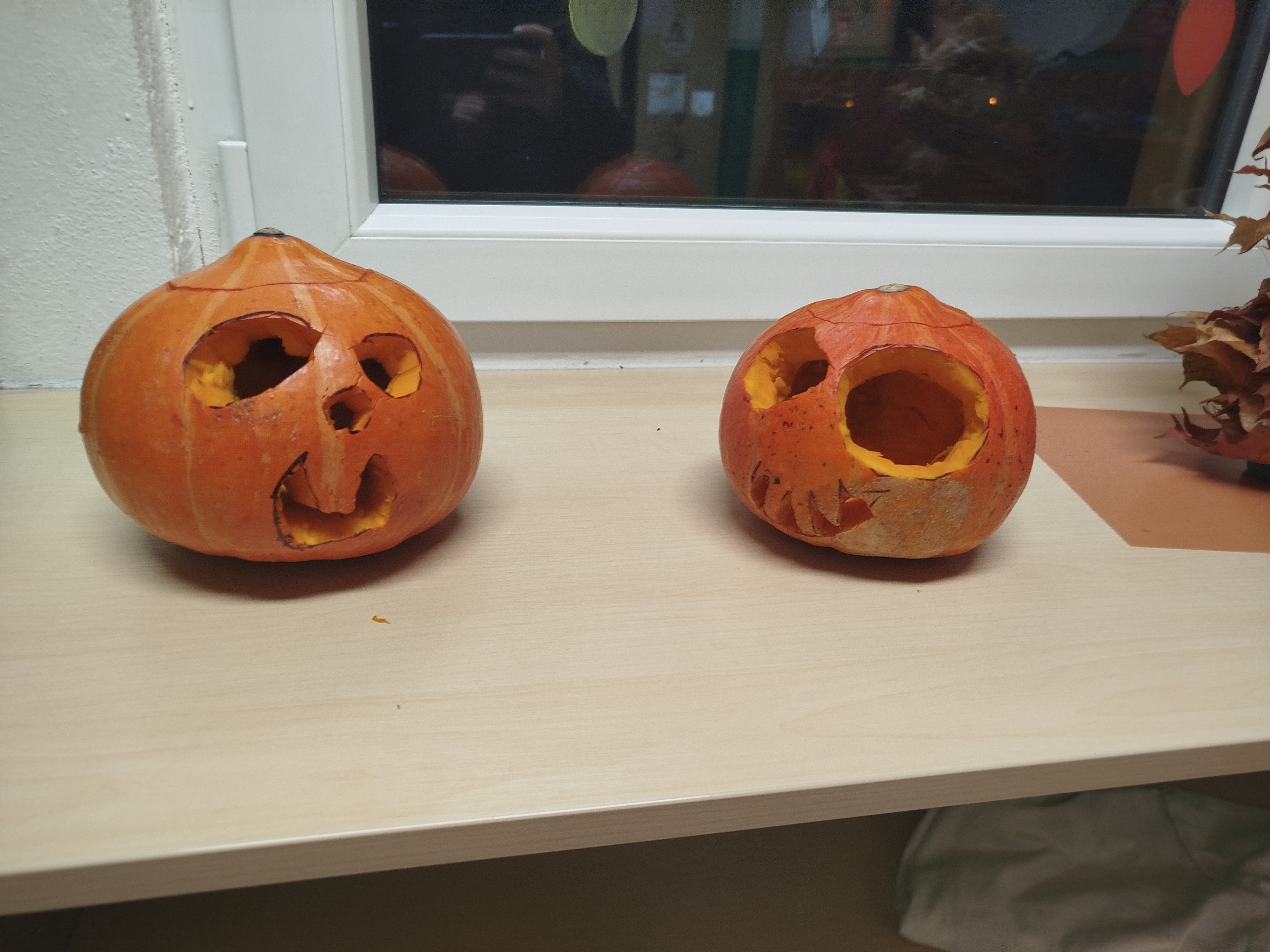 S dětmi jsme se rozhodly, že naši školku vyzdobíme halloweenskou výzdobou, a k tomu samozřejmě patří i dýně. Děti samy vymýšlely, co do dýní vyřežeme, a s nadšením se pustily i do jejich vydlabávání. Společně s paní učitelkou pak vyřezávaly veselé i strašidelné obličeje.