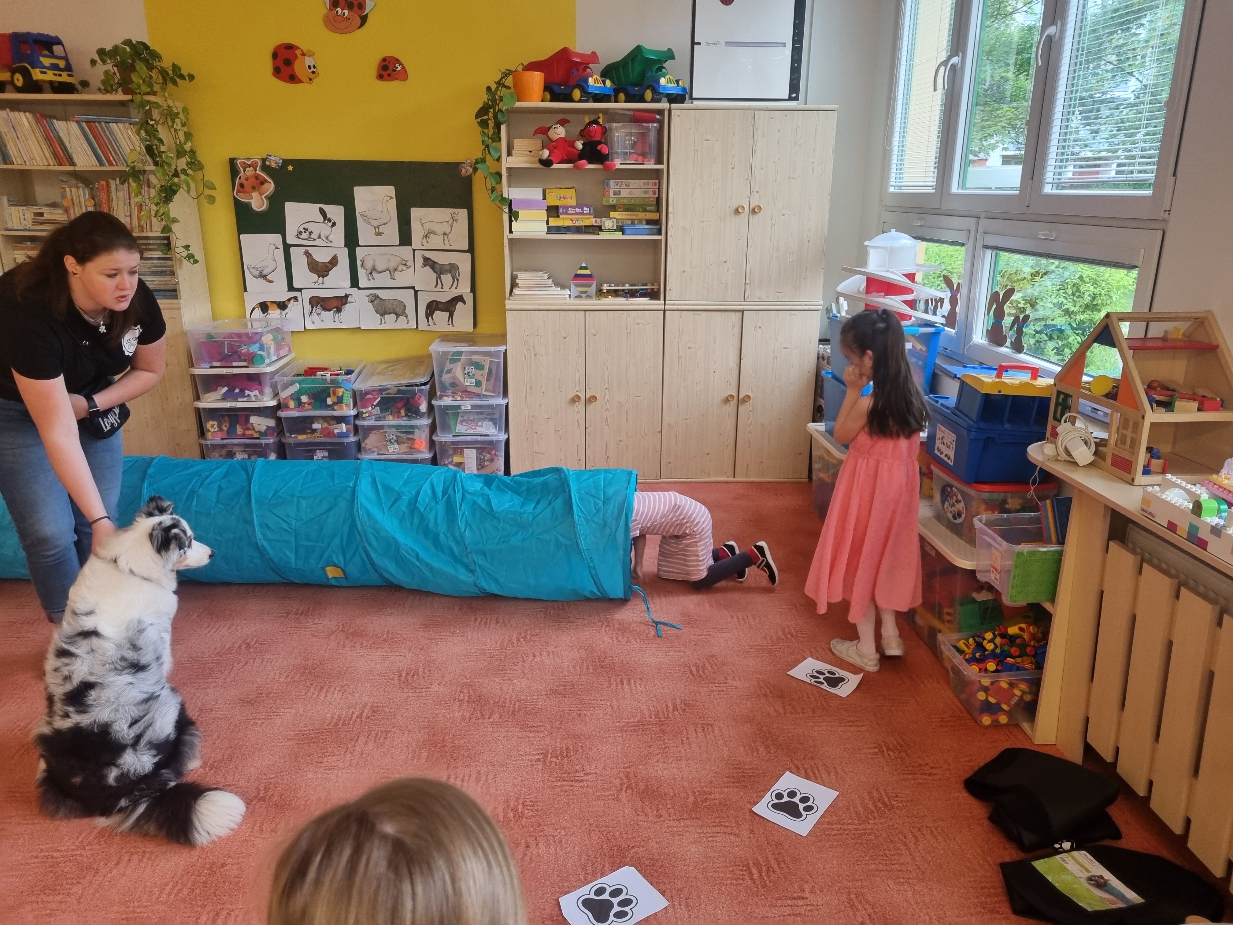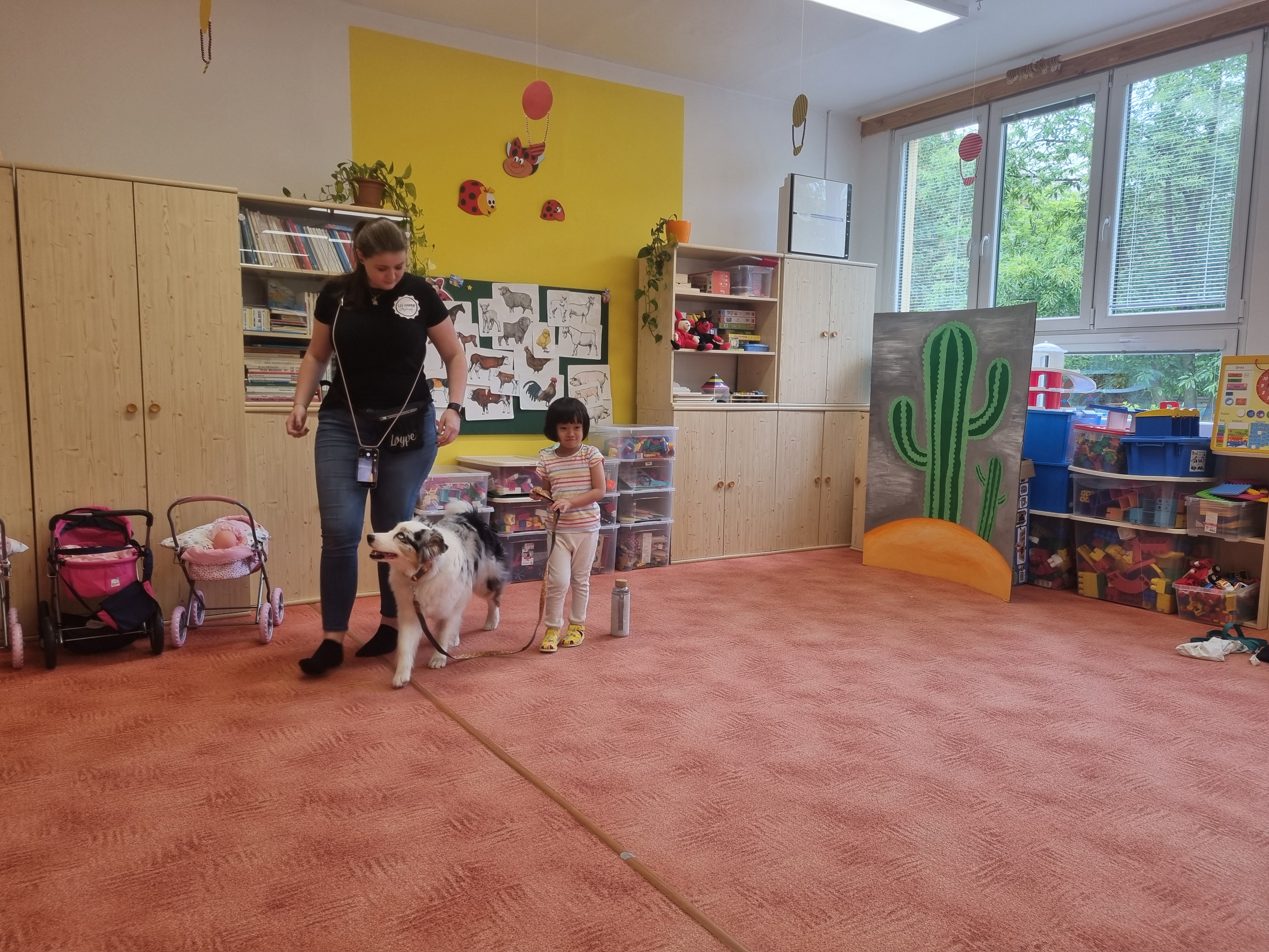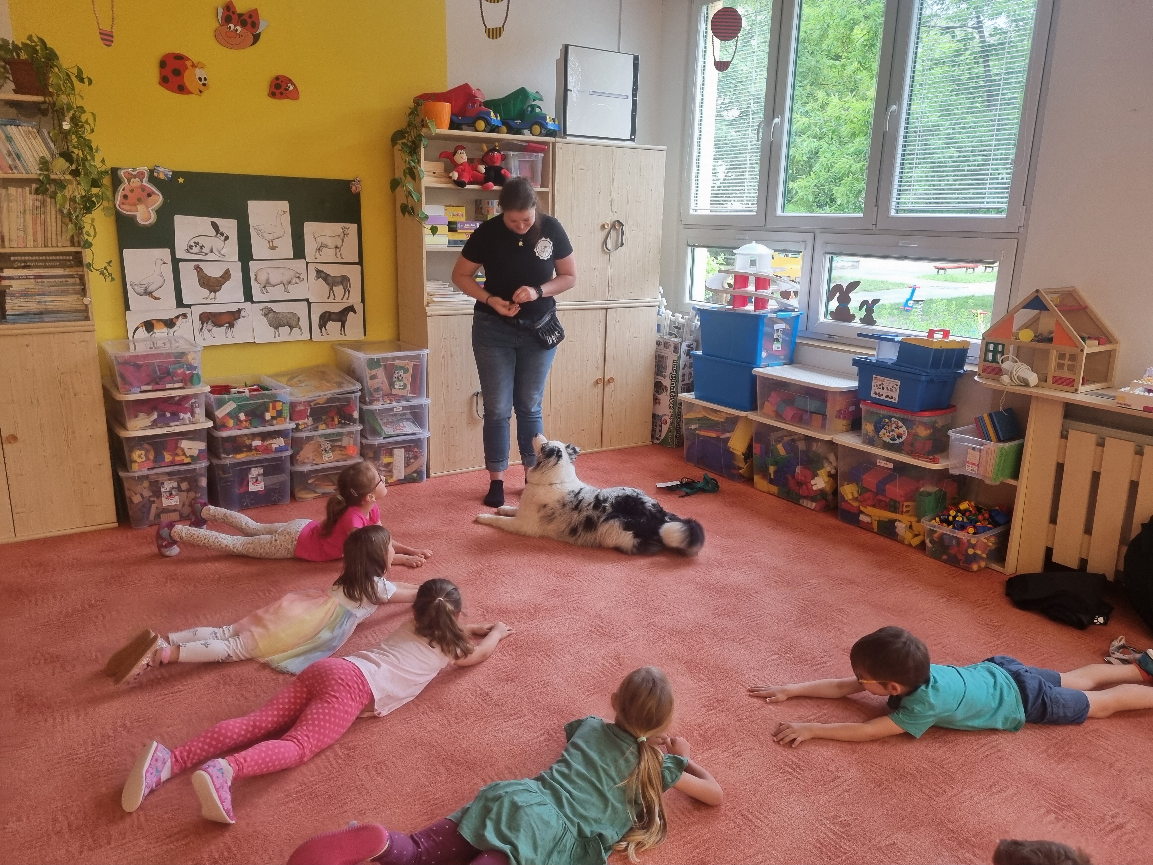 Navštívila nás slečna Šárka se svou tříletou fenkou Bailey. Připravili si pro nás krásný program: seznamování - slízávání tvarohu z dětských rukou, hledání obojku ke správnému vodítku, venčení pejska, pozorování jak pejsek vyčmuchá dobroty, opičí dráha s tunelem pro děti i pejska, vědomostí kvíz zaměřený na potravu pro pejska, děti si také mohly vyzkoušet nabídnout pejskovi ovoce a zeleninu a pozorovat, co má a nemá rád. Bailey a Šárka se s námi rozloučili psími kusy. Dětem se canisterapie velmi líbila.