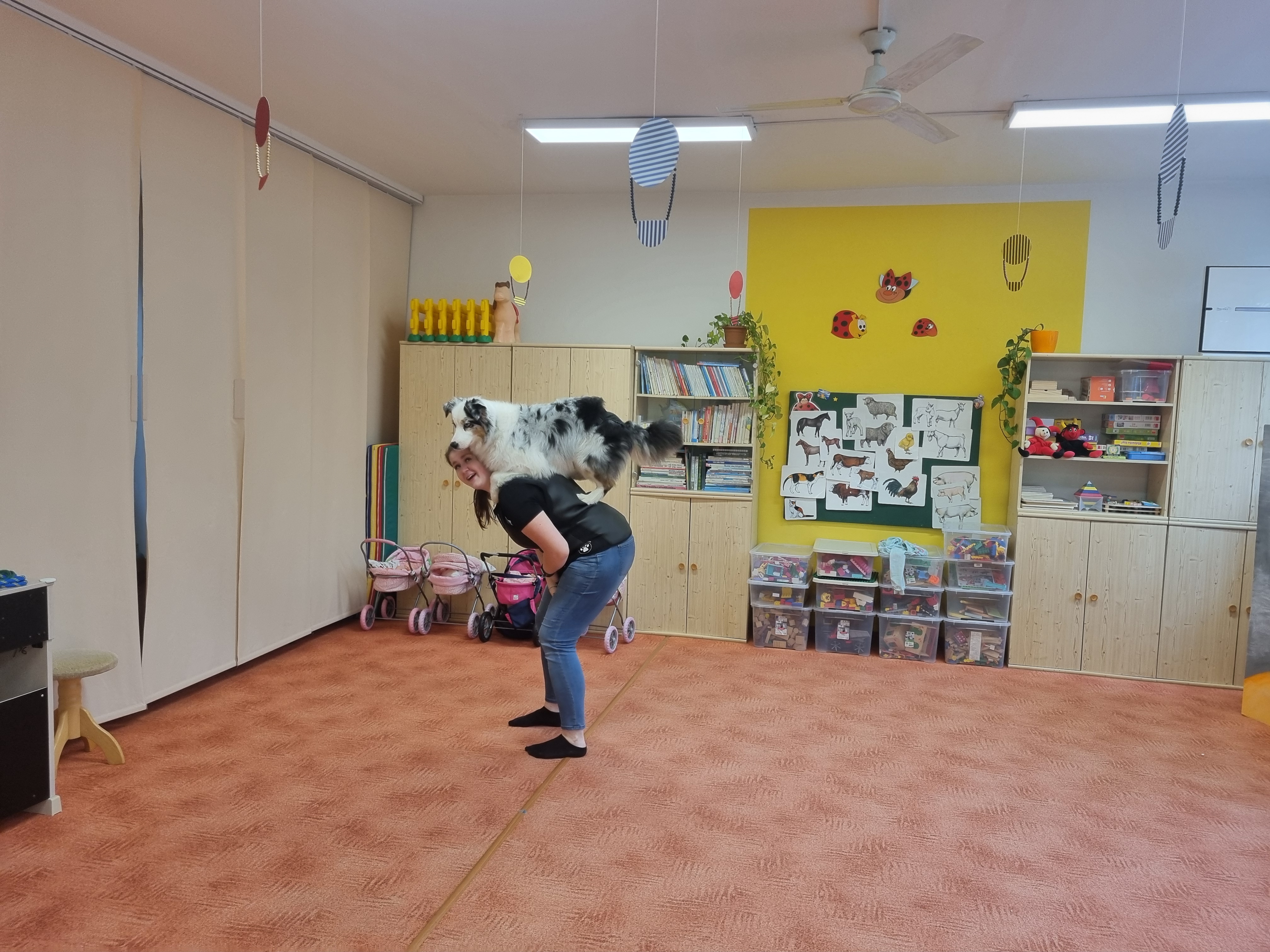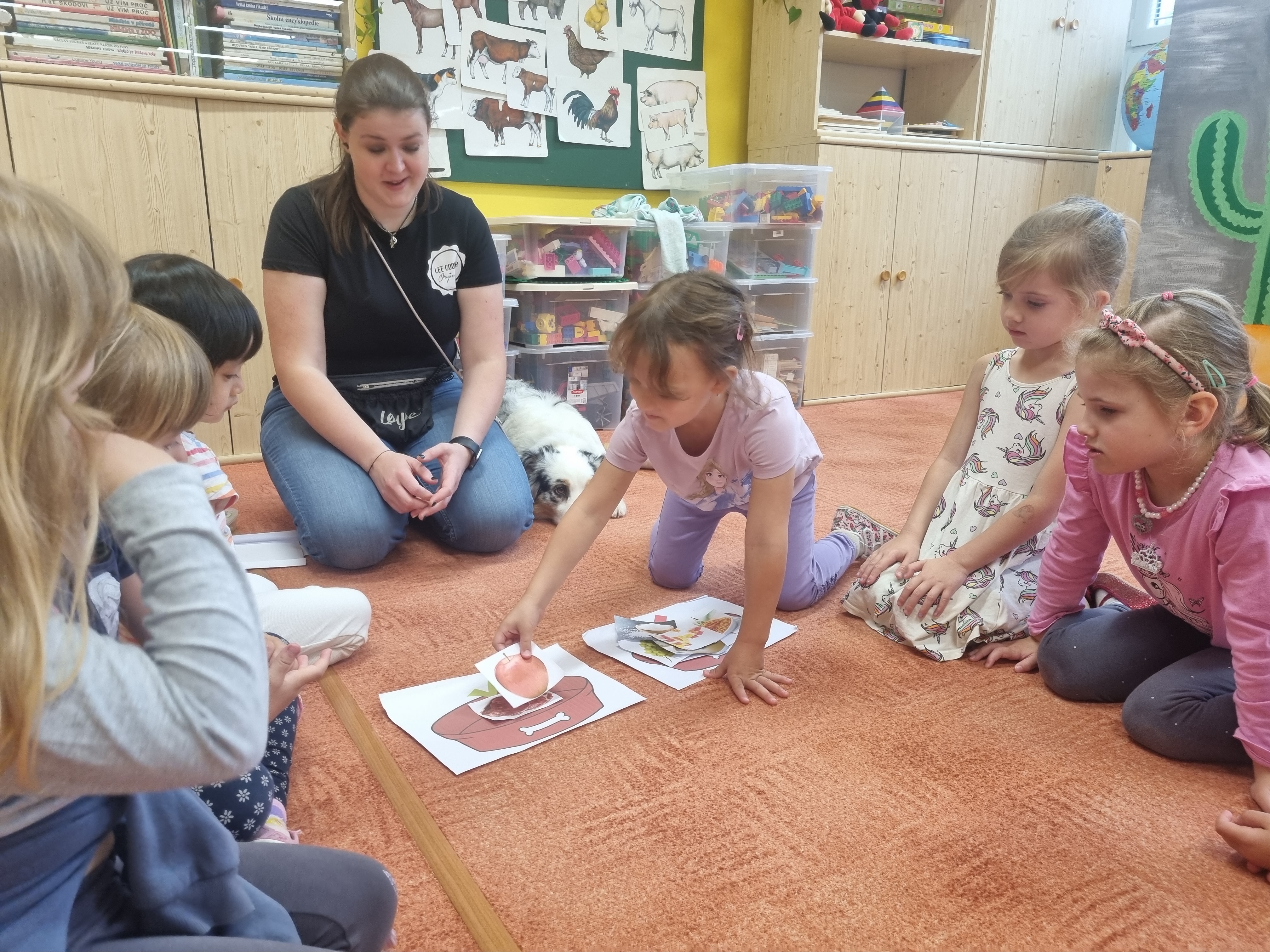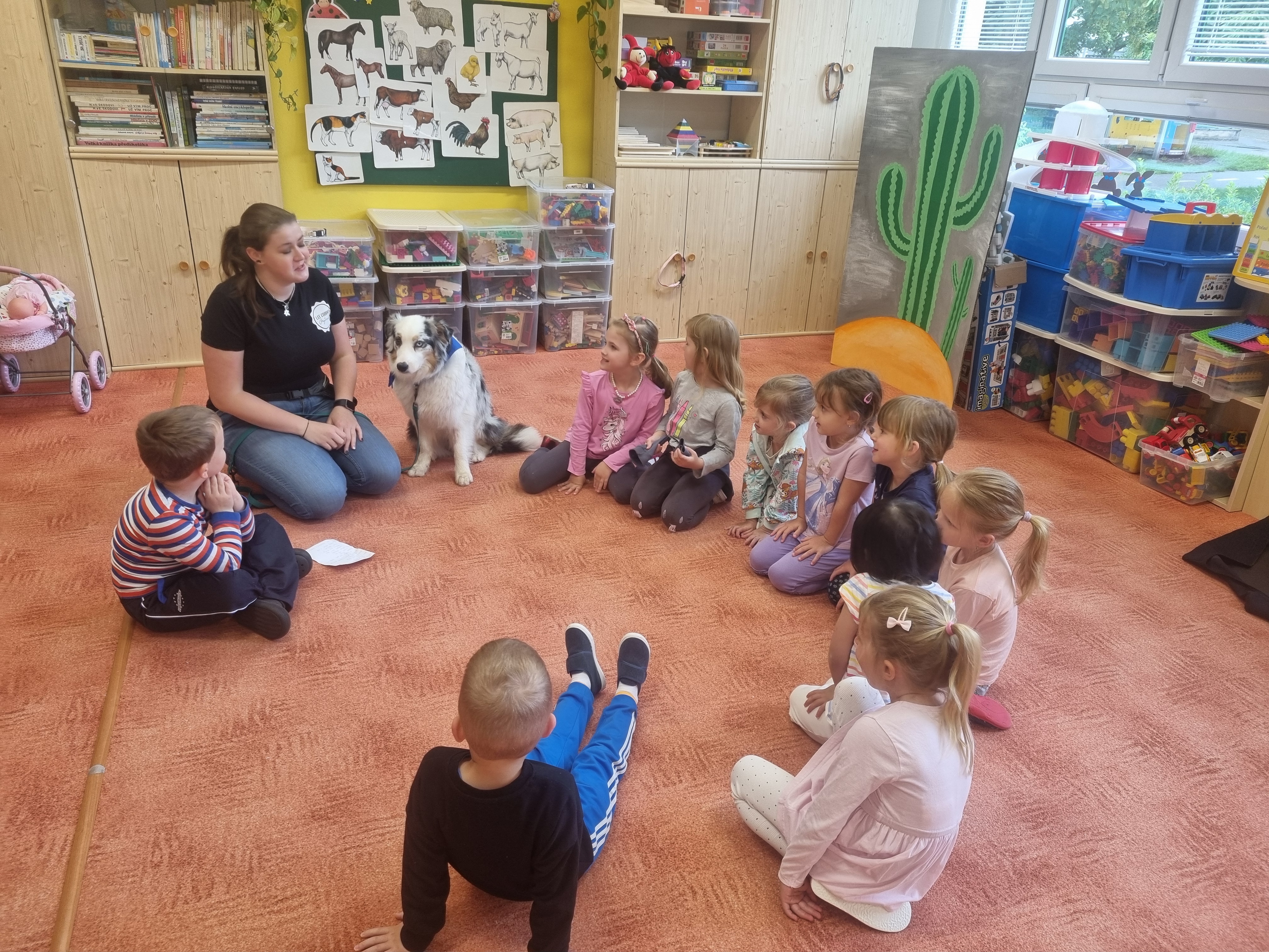 Navštívila nás slečna Šárka se svou tříletou fenkou Bailey. Připravili si pro nás krásný program: seznamování - slízávání tvarohu z dětských rukou, hledání obojku ke správnému vodítku, venčení pejska, pozorování jak pejsek vyčmuchá dobroty, opičí dráha s tunelem pro děti i pejska, vědomostí kvíz zaměřený na potravu pro pejska, děti si také mohly vyzkoušet nabídnout pejskovi ovoce a zeleninu a pozorovat, co má a nemá rád. Bailey a Šárka se s námi rozloučili psími kusy. Dětem se canisterapie velmi líbila.