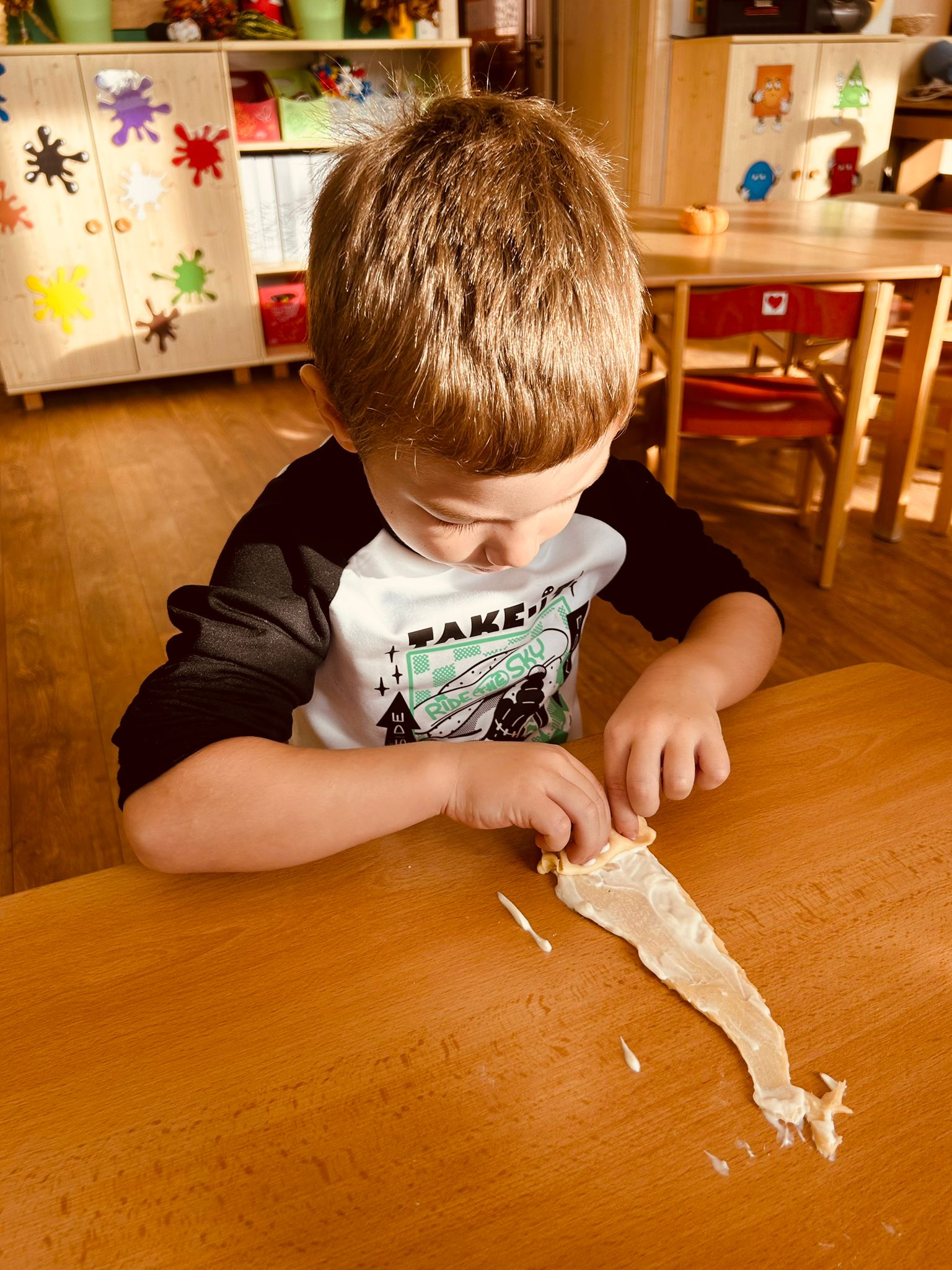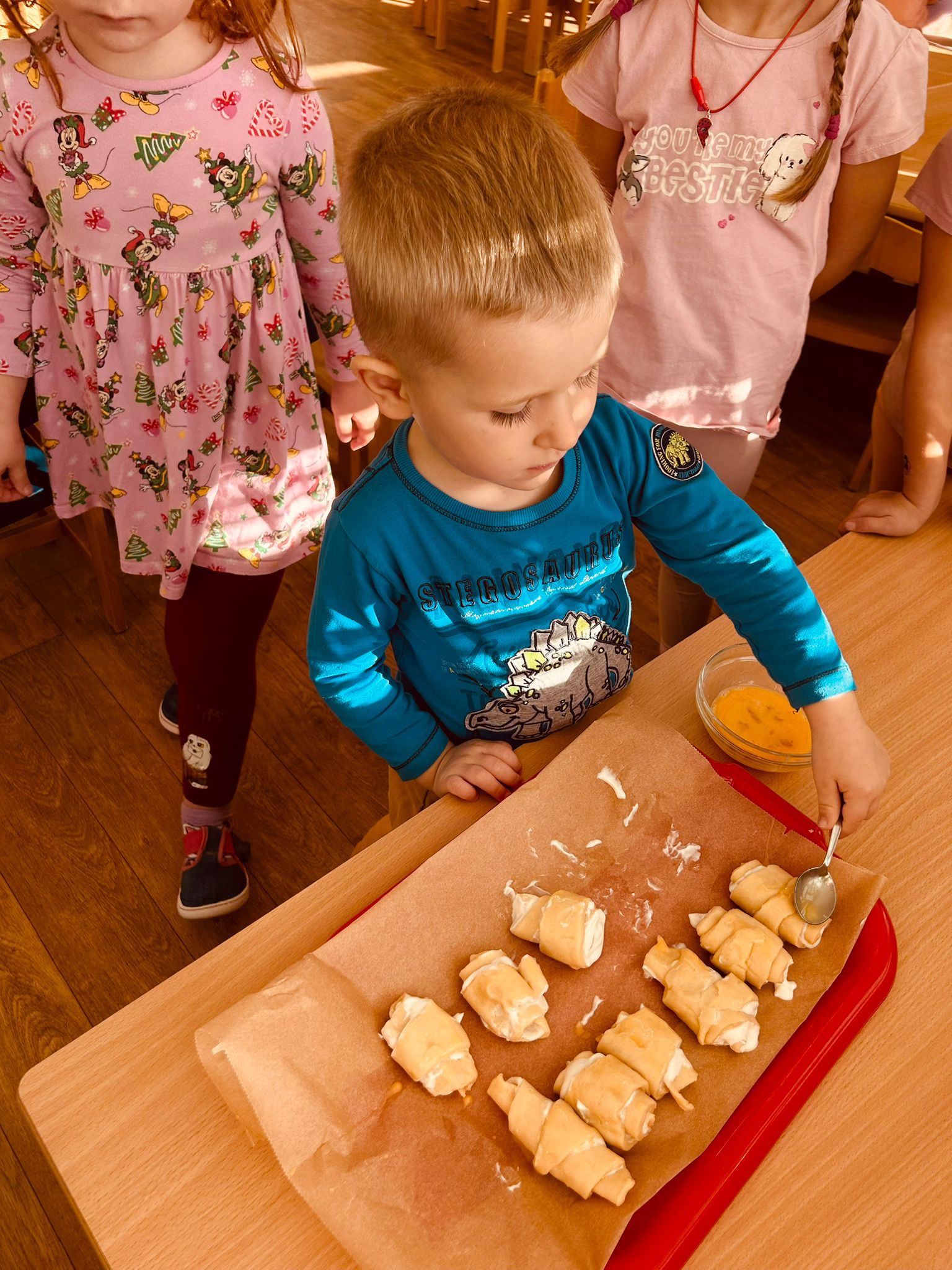Dnes jsme s dětmi pekly svatomartinské rohlíčky a byla to krásná voňavá společná aktivita. Děti si zkoušely válet těsto, tvarovat rohlíčky a plnit je náplní. Celou školku provoněla sladká vůně čerstvě upečeného pečiva a děti měly z výsledku obrovskou radost. Rohlíčky se povedly na jedničku a společné pečení jsme si všichni moc užili.